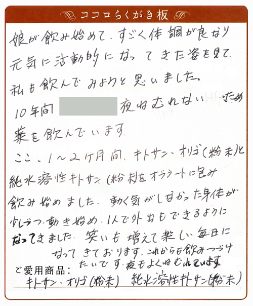 ココロのキトサン健康食品をお飲みになった全国の皆さんからのお便りです。